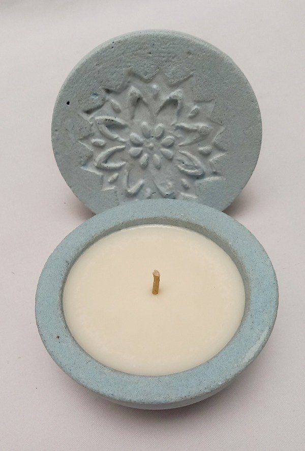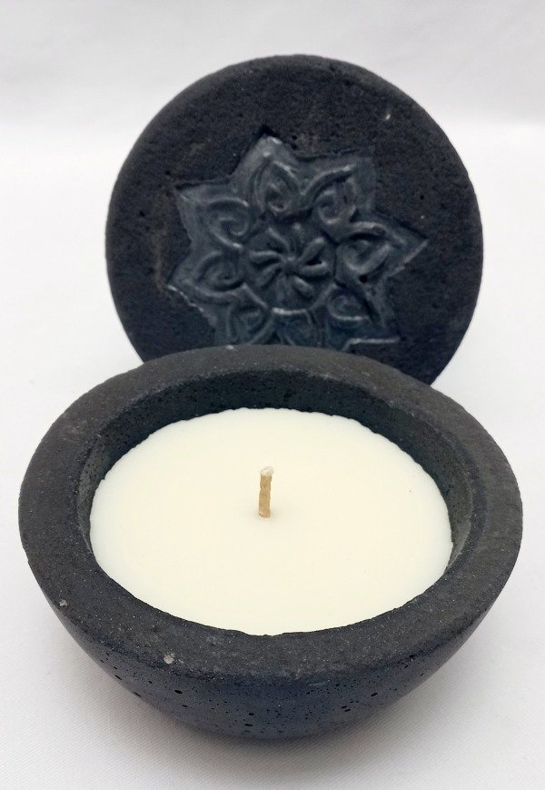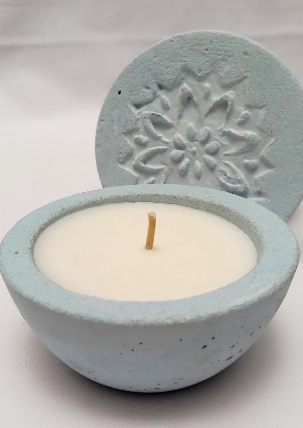 Bello cuenquito de cemento con tapa, 100 cc de cera de soja en tu esencia favorita: gardenia, lima verbena. magnolia, naranja pimienta, pepino melon, sandalo, tilo lavanda, vainilla, coco lima, cookies, cafe en venecia, pochoclo.