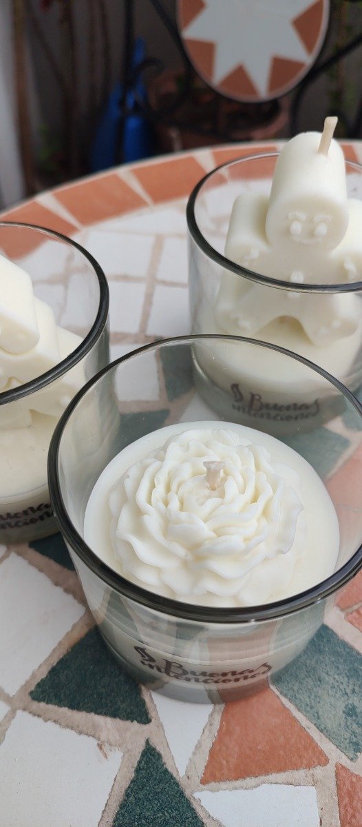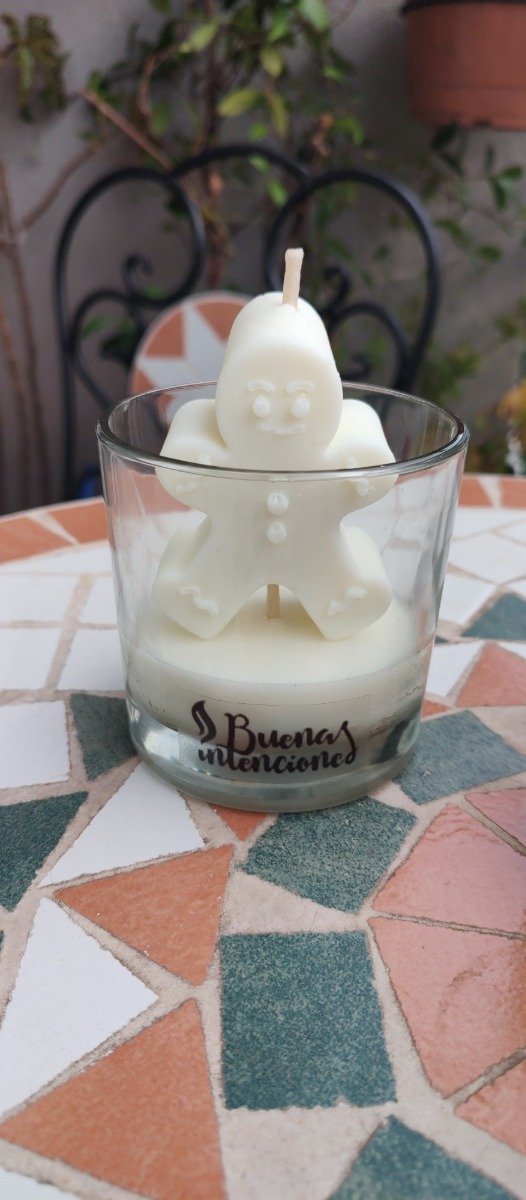 Vaso tipo whisky, vela cera de soja, con aplique hombrecito de jengibre o arbolito o con flores