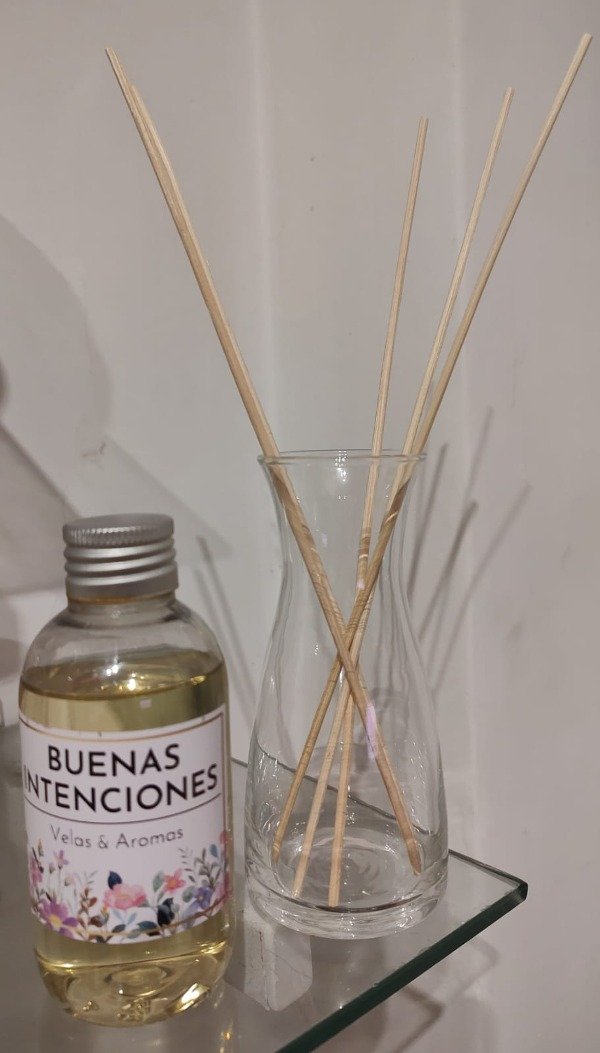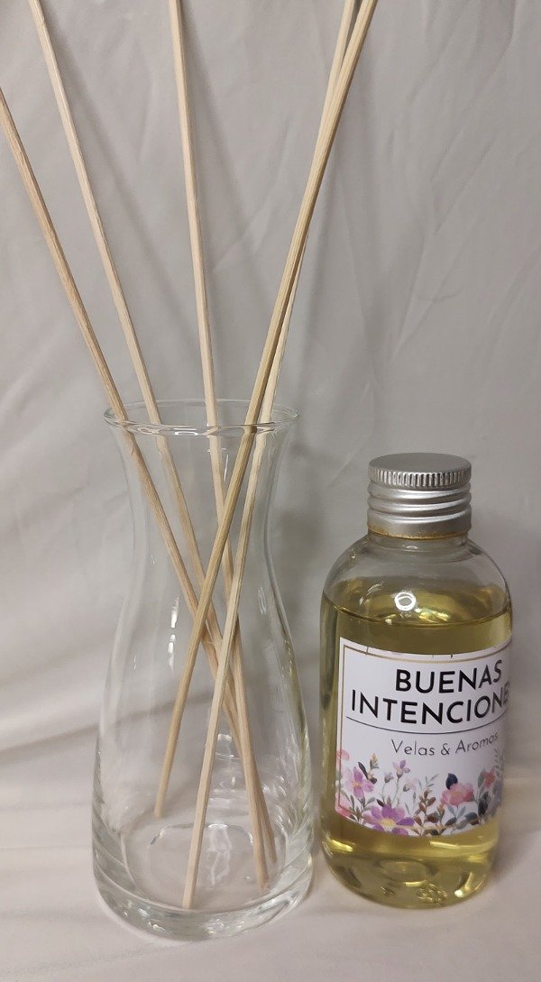 Coqueto florerito que usamos como difusor, viene con un envase de plastico de 125 cc. y varillas de rattan