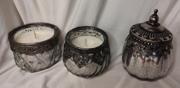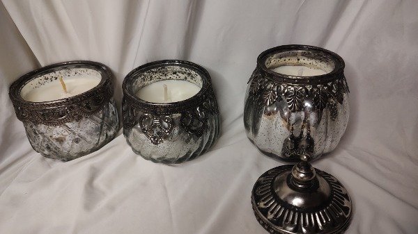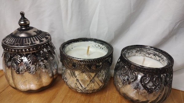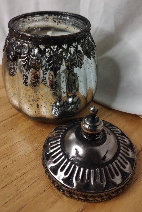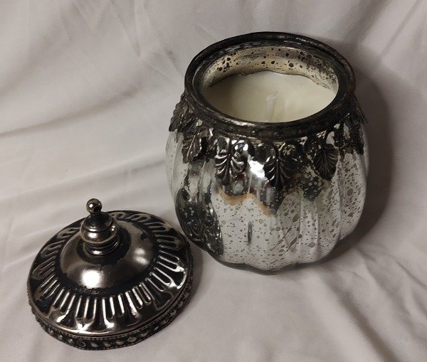 Un regreso al pasado, con esta vela que combina la simplicidad de la cera con la opulencia de los detalles en metal y el hermoso vidrio plateado. Es bellisima, viene con tapa de metal.