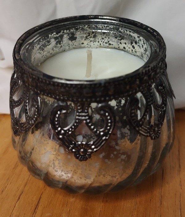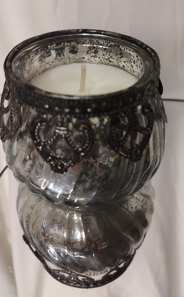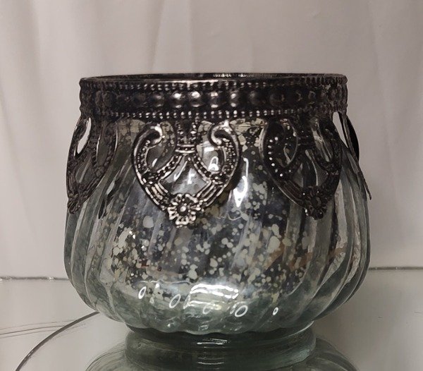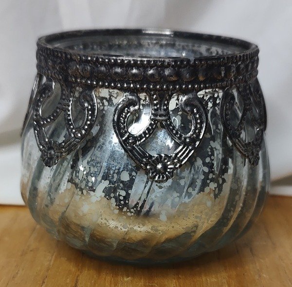 Crea un ambiente de misterio y romance con esta vela medieval, de vidrio plateado, con detalle de metal.